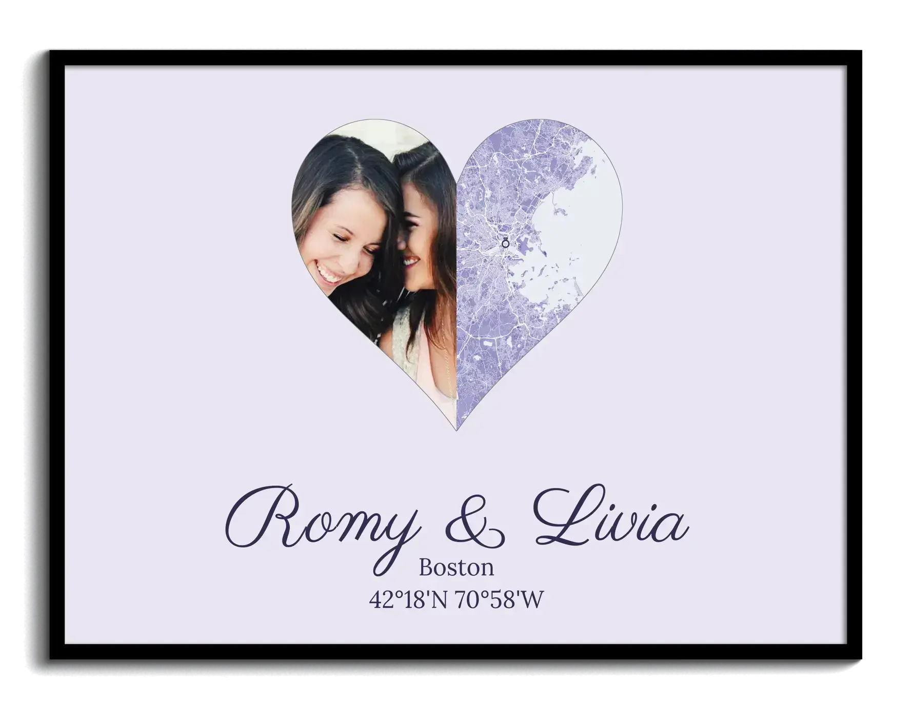 Crea ora il tuo cuore Split e ordinalo in pochi clic: metà con la tua foto, metà con la mappa della città e un marker sul luogo che conta. Sotto al cuore puoi aggiungere nomi, data, coordinate o una frase breve. È un regalo personalizzato per coppie, perfetto per anniversari, nozze o San Valentino.